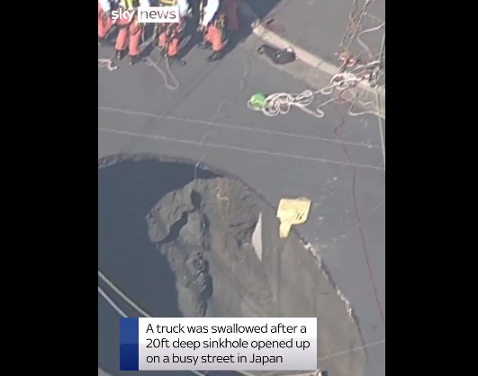 A sinkhole the size of a swimming pool opened up on a busy street in Japan, swallowing a truck and trapping the driver. pic.twitter.com/UocJodb7Qy