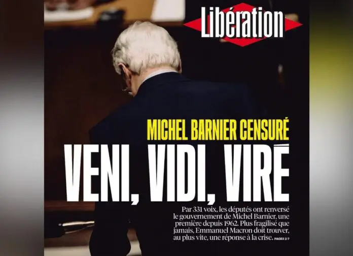 Η Libération σχολιάζει καυστικά την παραίτηση του Μπαρνιέ, δημοσιεύοντας πρωτοσέλιδο όπου τον απεικονίζει πλάτη, παραφράζοντας τη γνωστή φράση του Ιουλίου Καίσαρα “Veni, vidi, vici” σε “Veni, vidi, viré” – «Ήλθον, είδον, απολύθηκα». Η εφημερίδα επικρίνει τον πρόεδρο Εμανουέλ Μακρόν, επισημαίνοντας ότι βρίσκεται «πιο αδύναμος από ποτέ» και πρέπει να δώσει άμεσα λύση στην κρίση.