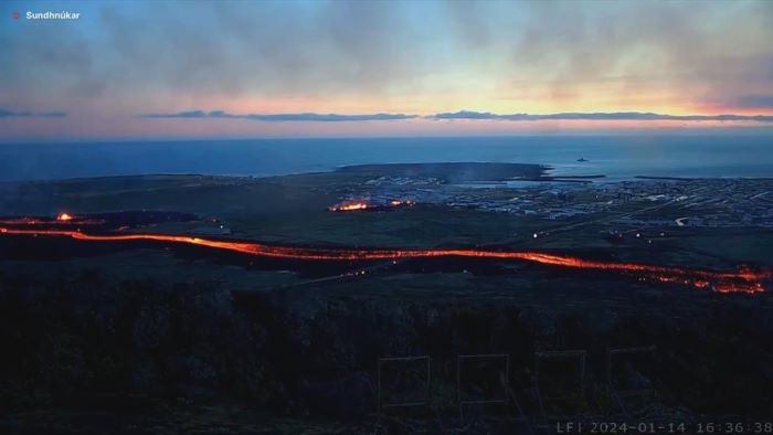 Η λάβα από την ηφαιστειακή έκρηξη, που βρίσκεται σε εξέλιξη στη νοτιοδυτική Ισλανδία, έφθασε σήμερα στο λιμάνι Γκρίνταβικ, όπου δύο σπίτια έπιασαν φωτιά, σύμφωνα με εικόνες που μεταδόθηκαν από τη δημόσια τηλεόραση.