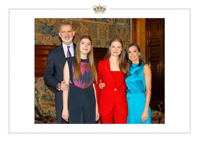 Η βασιλική οικογένεια ποζάρει με χαμόγελα, με τη βασιλιά Φελίπε να στέκεται πίσω από τη μικρότερη κόρη του, την Ινφάντα Σοφία, η οποία φορά μια ολόσωμη φόρμα σε σκούρα μπλε απόχρωση. Η βασίλισσα Λετίθια, ντυμένη με ένα σατέν γαλάζιο φόρεμα, αγκαλιάζει την κόρη της, την πριγκίπισσα Λεονόρ, η οποία δείχνει κομψή με ένα κόκκινο κοστούμι.