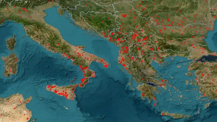Από την Ελλάδα στην Ισπανία και από τη νότια Γαλλία στην Κύπρο το δορυφορικό σύστημα της NASA καταγράφει τις εστίες των πυρκαγιών σε όλη τη Μεσόγειο.