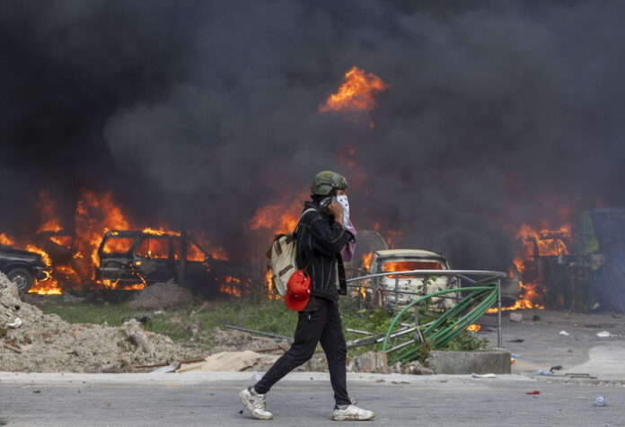 Καμένα αυτοκίνητα άλλα συντρίμμια είναι διάσπαρτα στην περιοχή γύρω από το κοινοβούλιο, όπου πυροσβέστες του στρατού προσπαθούν να σβήσουν πυρκαγιά στην κύρια αίθουσα, ενώ το εξωτερικό μέρος του κτηρίου είναι μαύρο από τον καπνό μετά την πυρπόλησή του χθες, Τρίτη, από τους διαδηλωτές.