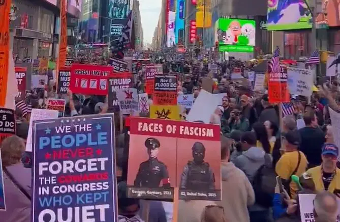 Thousands gather in New York’s Times Square for the nationwide “No Kings” protests against what organizers say are authoritarian actions by the Trump administration. Events are planned in all 50 states today. pic.twitter.com/eTUxiXKRlA
