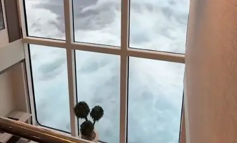 Αρκετοί επιβάτες φαίνονται να συγκεντρώνονται στα μεγάλα παράθυρα, καθώς τα κύματα υψώνονται προτού χτυπήσουν βίαια την πλατφόρμα θέασης.