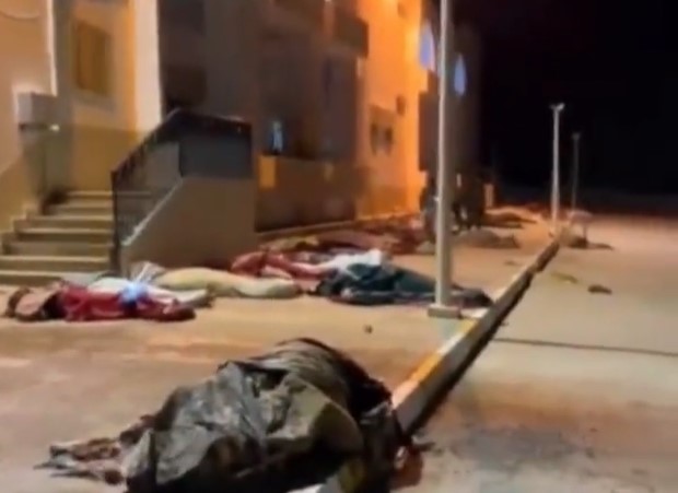 Στην είσοδο της Ντέρνα, μιας πόλης 100.000 κατοίκων στην ανατολική Λιβύη, μια ομάδα διασωθέντων αναζητούσαν καταφύγιο σήμερα, καθώς τα σπίτια τους καταστράφηκαν. Πολλοί φορούσαν πιτζάμες και παντόφλες, αφού δεν πρόλαβαν να αλλάξουν ρούχα: έφυγαν όσο πιο γρήγορα μπορούσαν για να σωθούν.
