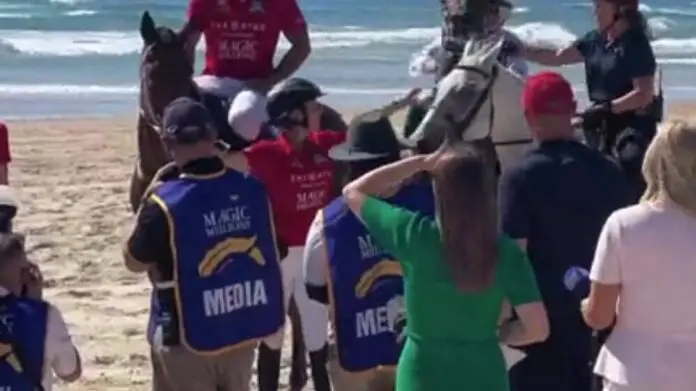 Η σκηνή εκτυλίχθηκε κατά τη διάρκεια φωτογράφισης στην παραλία, όπου η γαλαζοαίματη πόζαρε μπροστά σε τρία άλογα με αναβάτες.