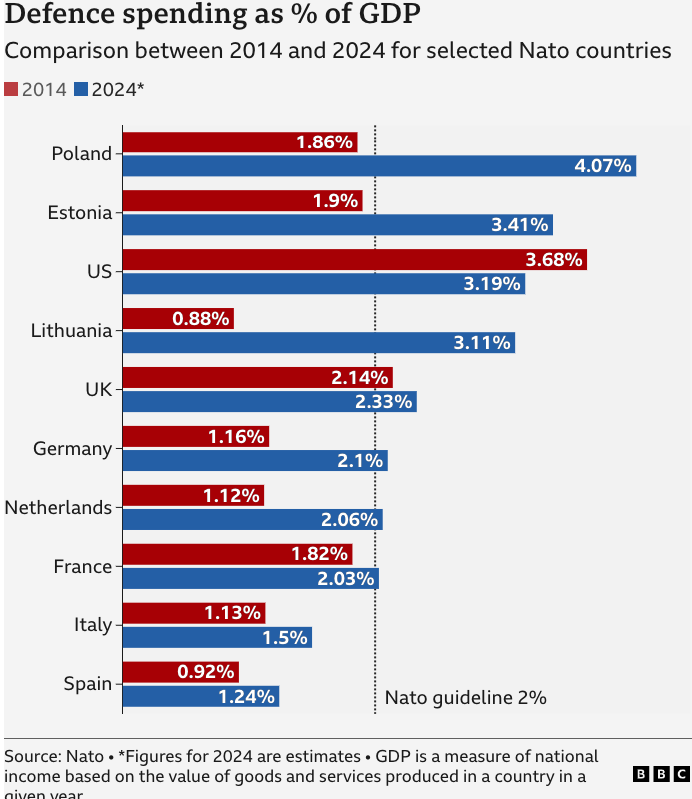 Εκτιμάται ότι 23 χώρες πέτυχαν τον στόχο του 2% το 2024, έναντι μόλις τριών το 2014.