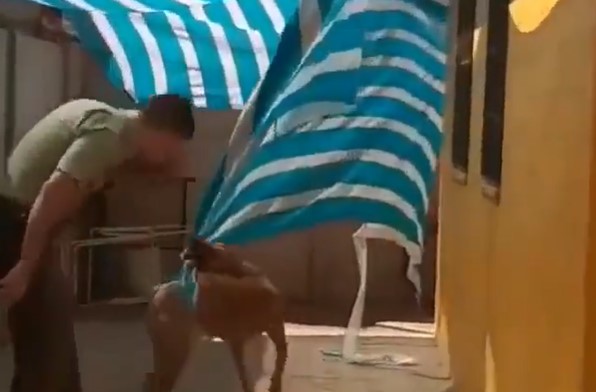 Το σκυλί βρίσκεται παγιδευμένο σε μια μικρή αυλή καθώς κάποιοι το έχουν δέσει με κομμάτια υφάσματος και τότε ένα αστυνομικός το βλέπει και το ελευθερώνει.