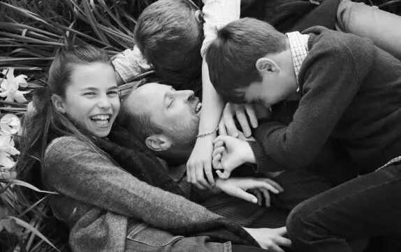 Μια φωτογραφία με τον Πρίγκιπα Ουίλιαμ να αγκαλιάζει τα παιδιά του κάτω από ένα δέντρο (πιθανότατα κερασιά).
