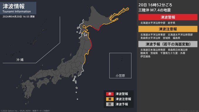 16時52分頃、三陸沖を震源とする地震。震源の深さは約10km、地震の規模はM7.4と推定。 pic.twitter.com/M2whlhQ7YP— 特務機関NERV (@UN_NERV) April 20, 2026