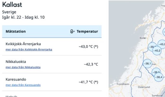 Είναι χαρακτηριστικό ότι στο Kvikkjokk της Λαπωνίας ο υδράργυρος βούτηξε στους -43,6, όπως ανέφερε την Τετάρτη το μετεωρολογικό ινστιτούτο SMHI στην πλατφόρμα Χ.