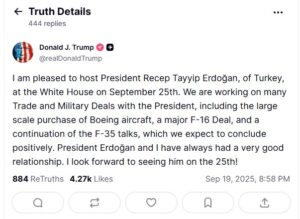 «Είμαι στην ευχάριστη θέση να φιλοξενήσω τον πρόεδρο Ρετζέπ Ταγίπ Ερντογάν, της Τουρκίας, στον Λευκό Οίκο στις 25 Σεπτεμβρίου. Εργαζόμαστε πάνω σε πολλές εμπορικές και στρατιωτικές συμφωνίες με τον πρόεδρο, συμπεριλαμβανομένης της μεγάλης κλίμακας αγοράς αεροσκαφών Boeing, μιας σημαντικής συμφωνίας για F-16, καθώς και της συνέχισης των συνομιλιών για τα F-35, που αναμένουμε να ολοκληρωθούν θετικά. Ο πρόεδρος Ερντογάν κι εγώ πάντα είχαμε μια πολύ καλή σχέση. Ανυπομονώ να τον δω στις 25 Σεπτεμβρίου!».