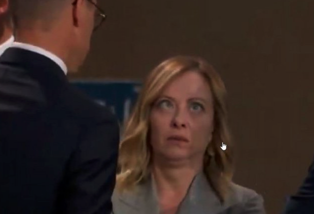 Ο φακός συνέλαβε την Μελόνι, την ώρα που μιλούσε με τον πρόεδρο της Φινλανδίας, Αλεξάντερ Στουμπ, να στρέφει το βλέμμα της στο ταβάνι και να κάνει γκριμάτσες με το πρόσωπό της, κάνοντας πώς κοιτά το ρολόι, που δεν φορούσε.