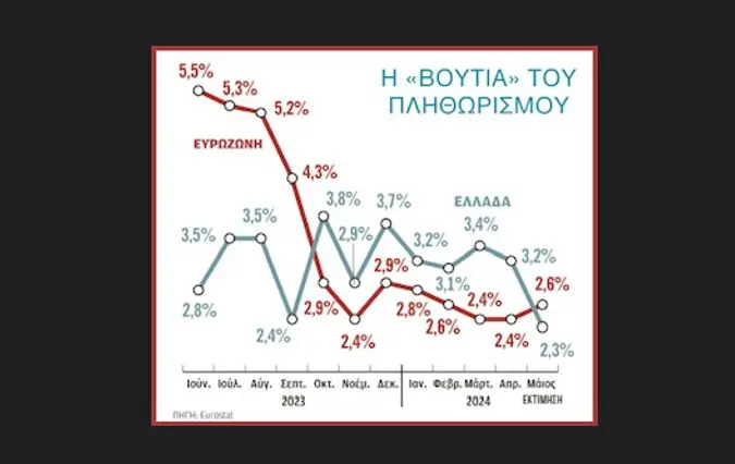 Σύμφωνα με την Eurostat ο ετήσιος πληθωρισμός στην Ελλάδα εκτιμάται ότι μειώθηκε σχεδόν κατά μία μονάδα, από το 3,2% τον Απρίλιο, στο 2,3% το Μάιο.