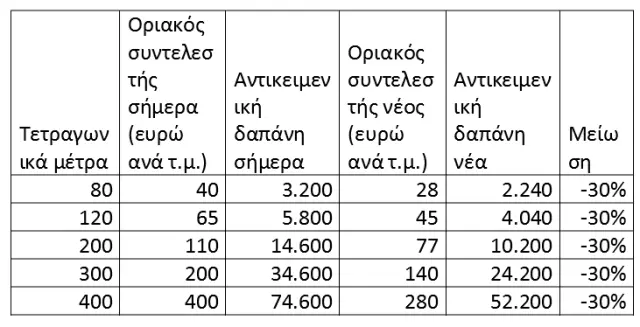 Σήμερα τα παραπάνω ποσά προσαυξάνονται, προκειμένου για κατοικίες που βρίσκονται σε περιοχές με τιμή ζώνης, σύμφωνα με τον αντικειμενικό προσδιορισμό των ακινήτων, από 2.800 ευρώ έως 4.999 ευρώ το τετραγωνικό μέτρο, κατά ποσοστό σαράντα τοις εκατό (40%) και για περιοχές με τιμή ζώνης από 5.000 ευρώ και άνω το τετραγωνικό μέτρο, κατά ποσοστό εβδομήντα τοις εκατό (70%).