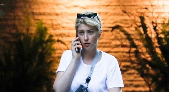 Η παρουσιάστρια του κεντρικού δελτίου ειδήσεων του ΣΚΑΪ και σύζυγος του δημάρχου Αθηναίων Κώστα Μπακογιάννη, δίχως ίχνος μακιγιάζ, με επιμελώς ατημέλητα τα μαλλιά της και φορώντας λευκά casual παπούτσια, λευκό αθλητικό μπλουζάκι και μαύρη φόρμα έδειχνε να απολαμβάνει τη βόλτα με τον γιο της.