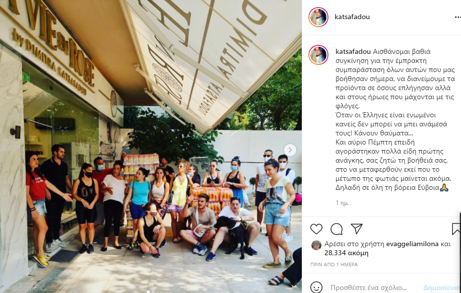 Μία ημέρα νωρίτερα η Δήμητρα Κατσαφάδου έσπευσε να ευχαριστήσει όσους ανταποκρίθηκαν στο διαδικτυακό κάλεσμά της για συλλογή και διανομή ειδών πρώτης ανάγκης στις πληγείσες περιοχές. «Αισθάνομαι βαθιά συγκίνηση για την έμπρακτη συμπαράσταση όλων αυτών που μας βοήθησαν σήμερα, να διανείμουμε τα προϊόντα σε όσους επλήγησαν αλλά και στους ήρωες που μάχονται με τις φλόγες.