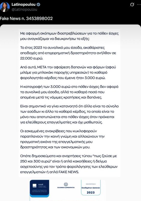 «Οι εσκεμμένες ανακρίβειες που κυκλοφορούν παραπλανούν την κοινή γνώμη και αλλοιώνουν την πραγματική εικόνα της επαγγελματικής μου δραστηριότητας και των οικονομικών μου. Δημοσιεύματα και αναρτήσεις τύπου “πώς ζούσε με 250 και 300 ευρώ” είναι είτε κακοήθειες, είτε δείγμα άγνοιας για τον τρόπο φορολόγησης των ελεύθερων επαγγελματιών, είτε απλά fake news», υπογράμμισε.