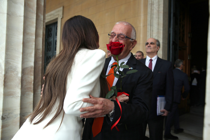 Ο Πρόεδρος της Βουλής την καλωσόρισε στην είσοδο του Κοινοβουλίου, στο Μνημείο του Άγνωστου Στρατιώτη, λίγο πριν από τις 14:30, προσφέροντάς της ένα κόκκινο τριαντάφυλλο και ανταλλάσσοντας μαζί της έναν θερμό ασπασμό.