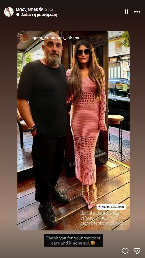 Ο Fancy James συνόδευσε την Κίμπερλι Γκίλφοϊλ σε γεύμα στο «νέο αγαπημένο του, χαλαρό και κομψό εστιατόριο» στην Αθήνα.
