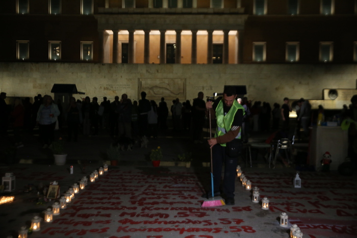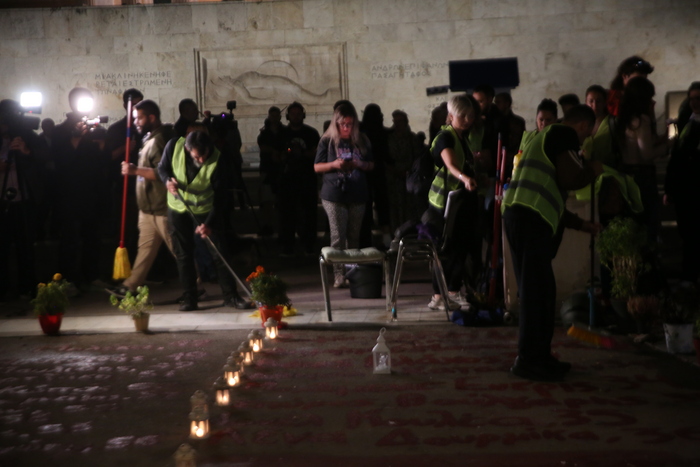 Ομάδα περίπου 30–40 αλληλέγγυων συγκεντρώθηκε το βράδυ της Κυριακής στο Μνημείο του Αγνώστου Στρατιώτη, μπροστά στο σημείο όπου είναι γραμμένα τα 57 ονόματα των θυμάτων των Τεμπών, και προχώρησε σε καθαρισμό του χώρου.