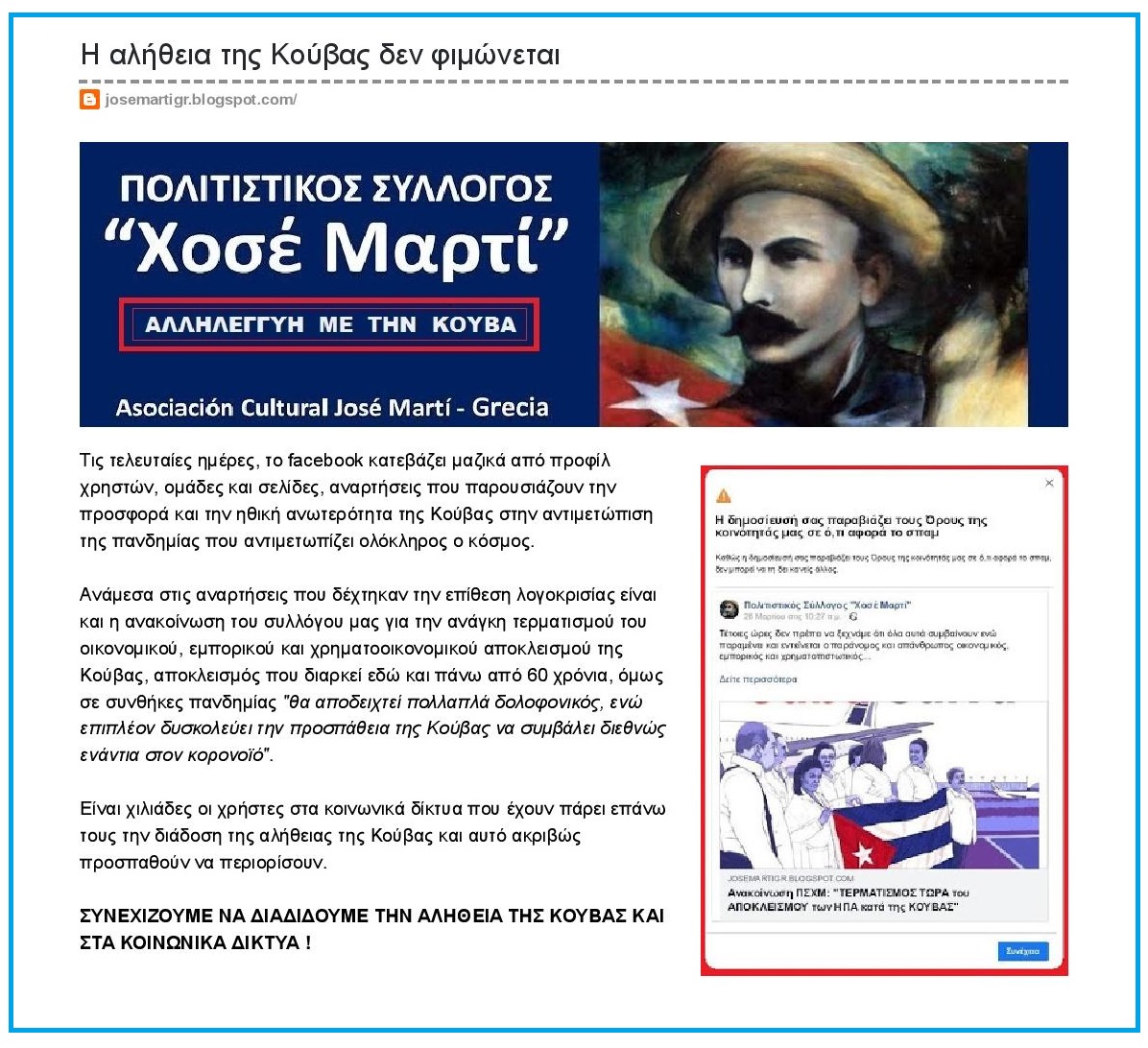 «Τις τελευταίες ημέρες, το facebook κατεβάζει μαζικά από προφίλ χρηστών, ομάδες και σελίδες, αναρτήσεις που παρουσιάζουν την προσφορά και την ηθική ανωτερότητα της Κούβας στην αντιμετώπιση της πανδημίας που αντιμετωπίζει ολόκληρος ο κόσμος. Ανάμεσα στις αναρτήσεις που δέχτηκαν την επίθεση λογοκρισίας είναι και η ανακοίνωση του συλλόγου μας για την ανάγκη τερματισμού του οικονομικού, εμπορικού και χρηματοοικονομικού αποκλεισμού της Κούβας, αποκλεισμός που διαρκεί εδώ και πάνω από 60 χρόνια, όμως σε συνθήκες πανδημίας ‘θα αποδειχτεί πολλαπλά δολοφονικός, ενώ επιπλέον δυσκολεύει την προσπάθεια της Κούβας να συμβάλει διεθνώς ενάντια στον κορονοϊό».