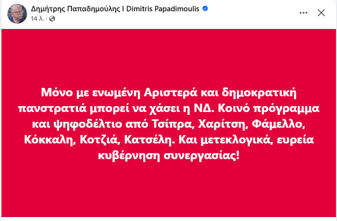 Η ανάρτηση του κ. Παπαδημούλη έχει ως εξής: