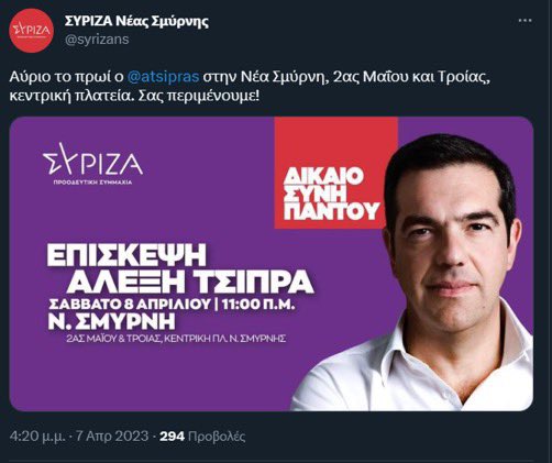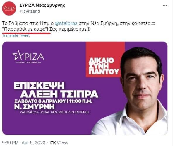 Η πρόσκληση του ΣΥΡΙΖΑ Νέας Σμύρνης μέσω Twitter για την ομιλία του Αλέξη Τσίπρα το Σάββατο (8/4) στην καφετέρια «Παραμύθι με καφέ» προκάλεσε πλήθος ειρωνικών σχολίων στα μέσα κοινωνικής δικτύωσης.
