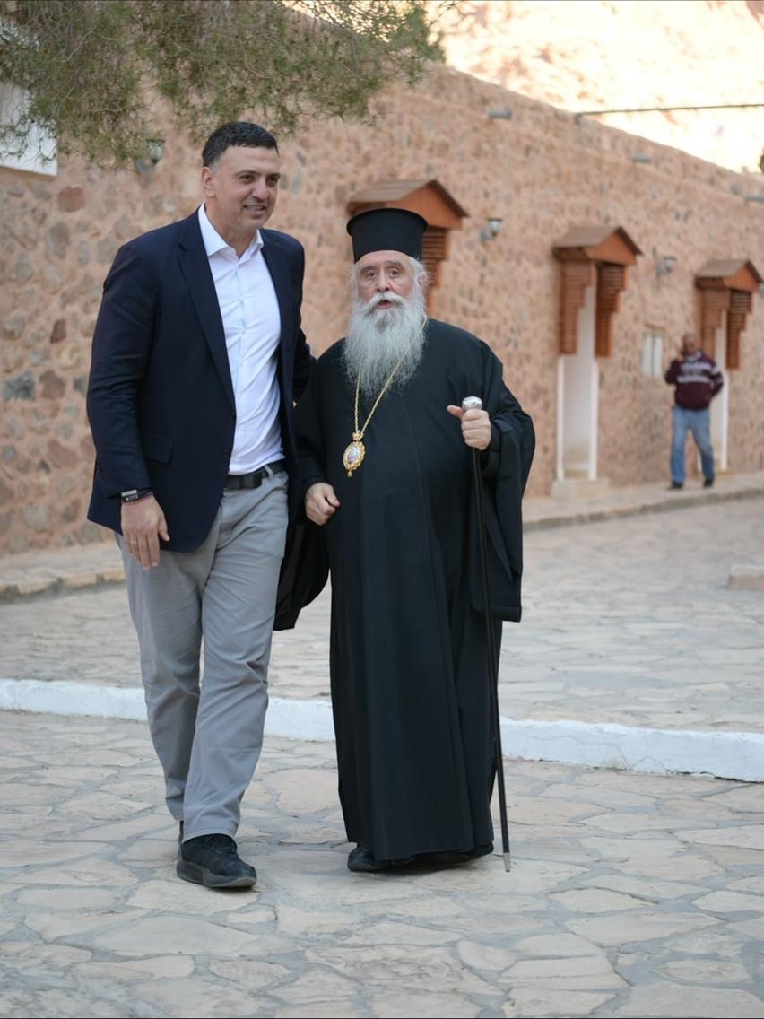 Ο υπουργός εξέφρασε ιδιαίτερη ευγνωμοσύνη προς τον Μακαριώτατο Αρχιεπίσκοπο Σινά, Φαράν και Ραϊθώ Συμεών, που τους ξενάγησε στη Μονή, αναδεικνύοντας την ιστορία και τη σπουδαιότητά της.