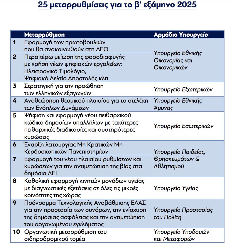 Παρακάτω ακολουθούν οι 25 μεταρρυθμίσεις για το δεύτερο εξάμηνο του 2025, ανά υπουργείο.
