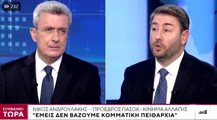 Καλεσμένος στο κεντρικό δελτίο ειδήσεων του ΑΝΤ1 και στον Νίκο Χατζηνικολάου, ήταν ο αρχηγός του ΠΑΣΟΚ- ΚΙΝΑΛ, Νίκος Ανδρουλάκης.