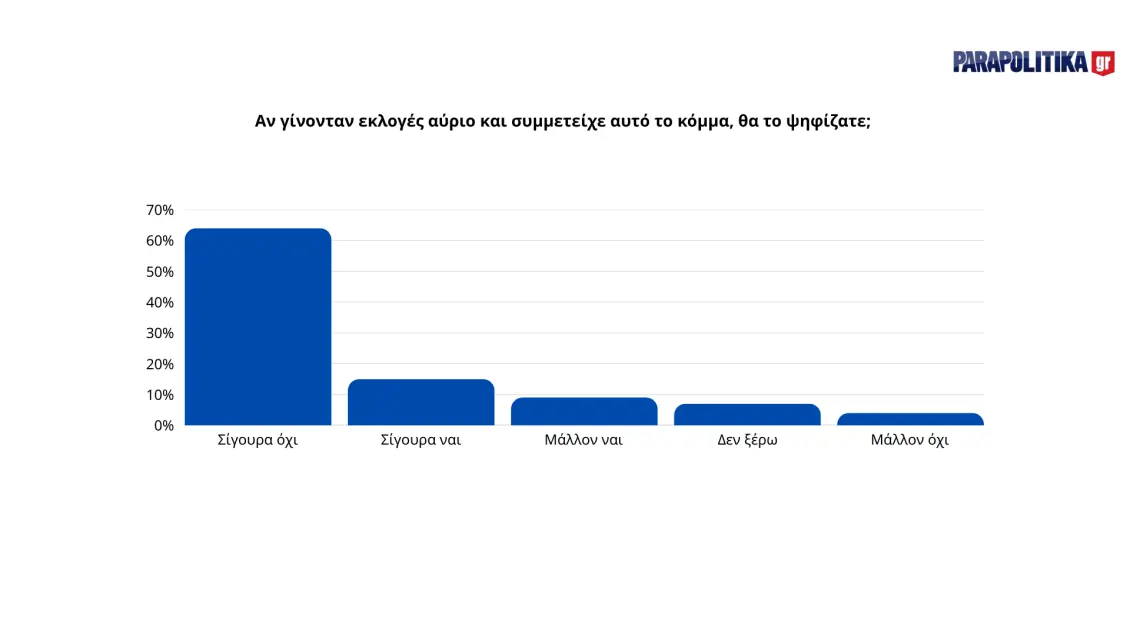 Στην κρίσιμη ερώτηση «Αν γίνονταν εκλογές αύριο και συμμετείχε αυτό το κόμμα, θα το ψηφίζατε;», το 63% απαντά αρνητικά («Σίγουρα όχι»), ενώ μόνο το 14% δηλώνει «Σίγουρα ναι». Το 8% λέει «Μάλλον ναι», το 6% «Δεν ξέρω» και το 4% «Μάλλον όχι». Παρά τα χαμηλά ποσοστά θετικής απάντησης, το συνδυασμένο ποσοστό των «Σίγουρα ναι» και «Μάλλον ναι» (22%) δείχνει ότι υπάρχει ένα μικρό, αλλά όχι αμελητέο τμήμα του εκλογικού σώματος που θα μπορούσε να στραφεί προς ένα τέτοιο κόμμα.