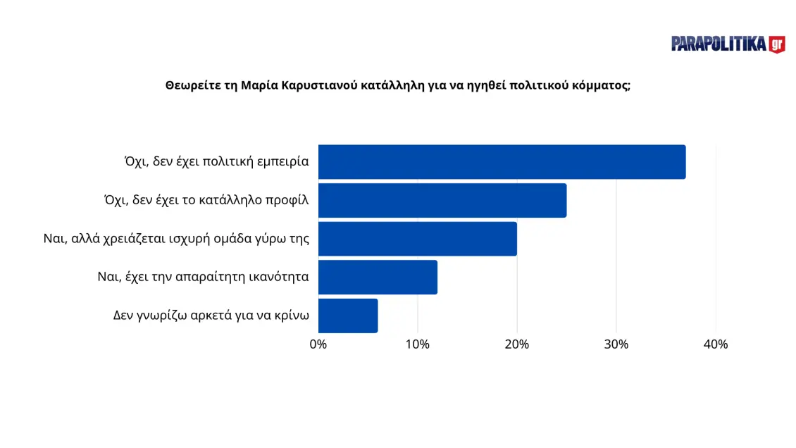 Όσον αφορά στην ικανότητα της Μαρίας Καρυστιανού να ηγηθεί πολιτικού σχήματος, οι απαντήσεις είναι αρνητικές. Το 37% θεωρεί ότι δεν έχει πολιτική εμπειρία, ενώ το 30% εκτιμά ότι δεν έχει το κατάλληλο προφίλ. Μόνο το 19% πιστεύει ότι χρειάζεται μια ισχυρή ομάδα γύρω της και το 10% θεωρεί ότι έχει την απαραίτητη ικανότητα. Αξίζει να σημειωθεί ότι μόλις το 4% δεν γνωρίζει ή δεν απαντά.