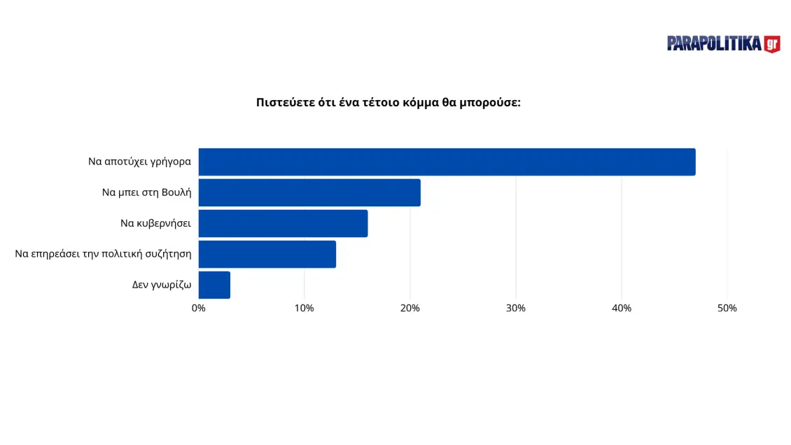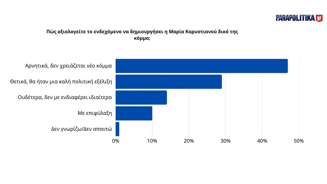 Η πλειοψηφία των συμμετεχόντων στη διαδικτυακή δημοσκόπηση του parapolitika.gr εκφράζει έντονες αμφιβολίες για το ενδεχόμενο δημιουργίας νέου κόμματος από τη Μαρία Καρυστιανού. Σύμφωνα με τα στοιχεία, το 48% των πολιτών πιστεύει ότι ένα τέτοιο κόμμα θα πρέπει να αποτύχει γρήγορα, ενώ περίπου το 20% εκτιμά ότι θα μπει στη Βουλή. Μόλις το 17% προβλέπει ότι θα κυβερνήσει, ενώ το 13% θεωρεί ότι θα επηρεάσει την πολιτική συζήτηση.