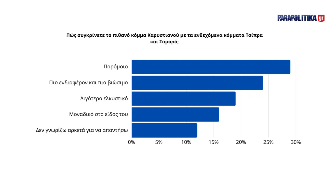 Σε μια υποθετική σύγκριση με ενδεχόμενα νέα κόμματα από τον Αλέξη Τσίπρα ή τον Αντώνη Σαμαρά, το 29% θεωρεί ότι ένα κόμμα Καρυστιανού θα ήταν παρόμοιο, ενώ το 28% εκτιμά ότι θα ήταν πιο ενδιαφέρον και πιο βιώσιμο. Το 22% το θεωρεί λιγότερο ελκυστικό, το 15% μοναδικό στο είδος του και το 13% δεν γνωρίζει αρκετά για να απαντήσει. Η σύγκριση αυτή είναι ιδιαίτερα αποκαλυπτική, καθώς δείχνει ότι σχεδόν το 30% των πολιτών βλέπει το κόμμα Καρυστιανού ως μια φρέσκια εναλλακτική στα παραδοσιακά πολιτικά σχήματα.