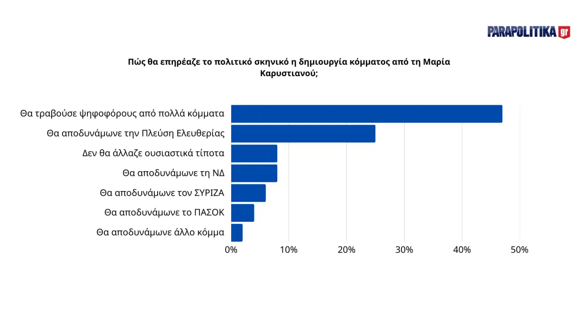Παρά τη δυσπιστία, οι πολίτες αναγνωρίζουν ότι ένα νέο κόμμα με επικεφαλής τη Μαρία Καρυστιανού θα άφηνε το αποτύπωμά του στην ελληνική πολιτική. Σχεδόν το 48% πιστεύει ότι θα τραβούσε ψηφοφόρους από πολλά κόμματα, ενώ το 25% εκτιμά ότι θα αποδυνάμωνε την Πλεύση Ελευθερίας. Μικρότερα ποσοστά (7-8%) θεωρούν ότι θα αποδυνάμωνε ΝΔ, ΣΥΡΙΖΑ ή ΠΑΣΟΚ, ενώ το 10% πιστεύει ότι δεν θα άλλαζε ουσιαστικά τίποτα.