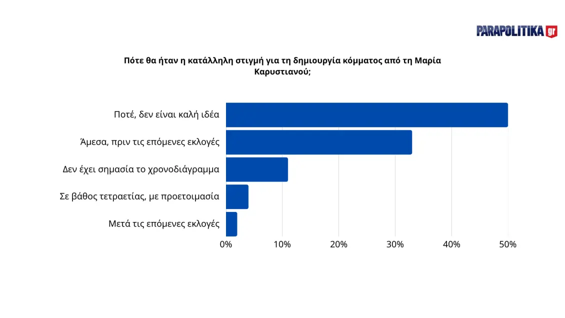 Όταν ρωτήθηκαν πότε θα ήταν η καταλληλότερη στιγμή για τη δημιουργία νέου κόμματος από τη Μαρία Καρυστιανού, το 48% απάντησε «ποτέ, δεν είναι καλή ιδέα», ενώ το 37% θεωρεί ότι ο κατάλληλος χρόνος είναι άμεσα, πριν τις επόμενες εκλογές. Μικρότερα ποσοστά (9-10%) αναφέρουν ότι δεν έχει σημασία το χρονοδιάγραμμα ή θα έπρεπε να γίνει σε βάθος τετραετίας, με προετοιμασία, ενώ το 3% δεν γνωρίζει ή δεν απαντά.