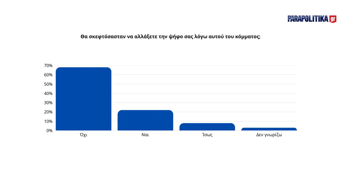 Η επιφυλακτικότητα φαίνεται και στην ερώτηση σχετικά με την αλλαγή ψήφου: Το 67% των ερωτηθέντων δηλώνει ότι δεν θα άλλαζε την ψήφο του λόγω αυτού του κόμματος, ενώ μόνο το 21% απαντά θετικά.