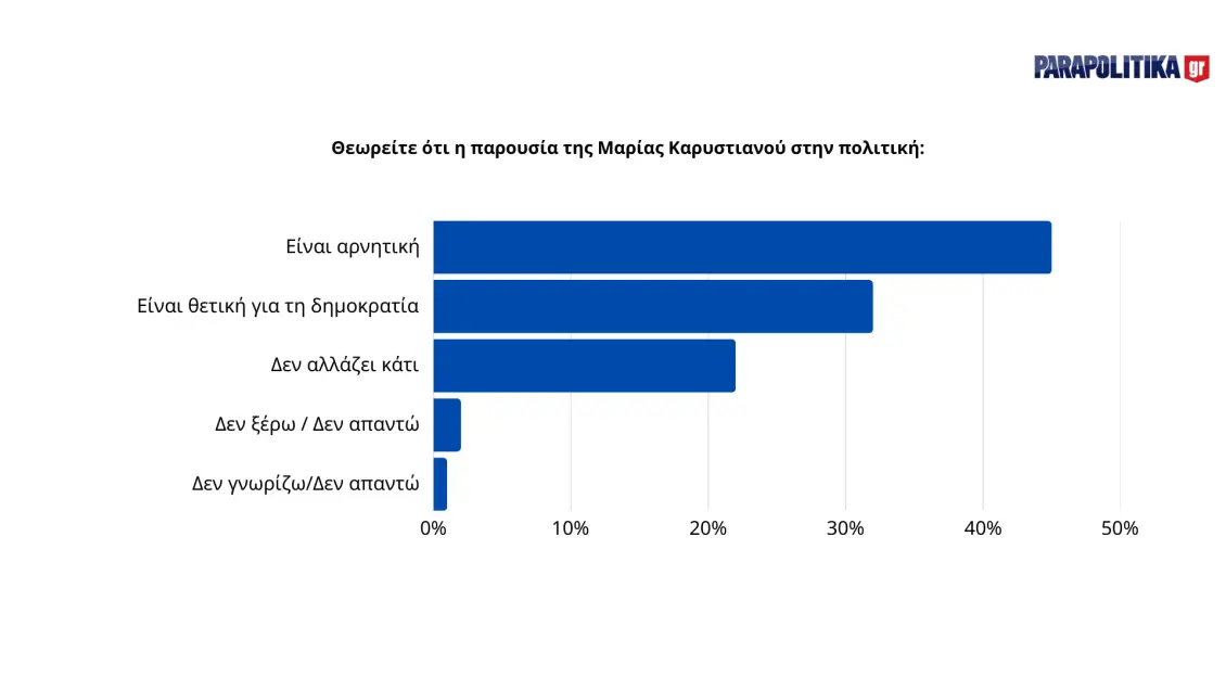 Σχετικά με την αξιολόγηση της παρουσίας της Μαρίας Καρυστιανού στην πολιτική, οι απόψεις είναι διχασμένες. Το 45% θεωρεί την παρουσία της αρνητική, ενώ το 33% τη θεωρεί θετική για τη δημοκρατία. Το 21% πιστεύει ότι δεν αλλάζει κάτι, ενώ μικρά ποσοστά (3-2%) δεν ξέρουν ή δεν απαντούν. Η διάσταση αυτή αντικατοπτρίζει τη βαθύτερη πόλωση που χαρακτηρίζει την ελληνική κοινωνία σχετικά με τον ρόλο νέων προσώπων στην πολιτική σκηνή.