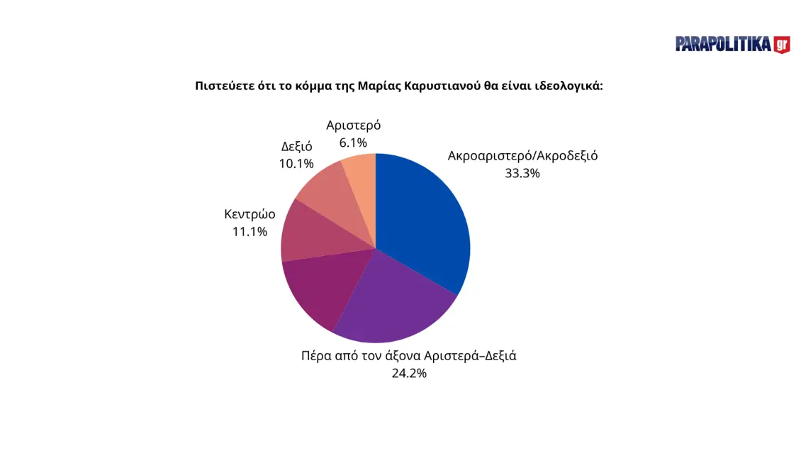 Η ιδεολογική κατηγοριοποίηση ενός πιθανού κόμματος Καρυστιανού παρουσιάζει ιδιαίτερο ενδιαφέρον. Το 33,3% των ερωτηθέντων πιστεύει ότι θα ήταν ακροαριστερό ή ακροδεξιό, ενώ το 24,2% το τοποθετεί πέρα από τον άξονα Αριστερά-Δεξιά. Μόλις το 11,1% το θεωρεί κεντρώο, το 10,1% δεξιό και το 6,1% αριστερό. Τα δεδομένα αυτά υποδεικνύουν ότι οι πολίτες βλέπουν το «κόμμα Καρυστιανού» ως ένα σχήμα που θα κινείται στα όρια του πολιτικού φάσματος, με έντονα χαρακτηριστικά που δεν εντάσσονται εύκολα στις παραδοσιακές κατηγορίες.