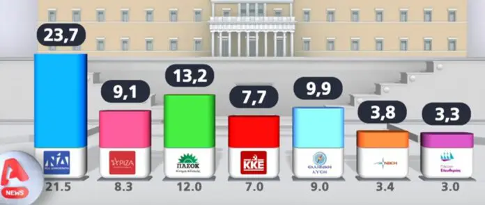 Η ΝΔ συγκεντρώνει ποσοστό 23,7% με άνετο προβάδισμα 10,5 ποσοστιαίων μονάδων αν και πεσμένη από το 28,3% των ευρωεκλογών. Το ΠΑΣΟΚ παραμένει δεύτερο κόμμα ανεβάζοντας τα ποσοστά του σε σχέση με τις ευρωεκλογές συγκεντρώνοντας 13,2%. Τρίτο κόμμα η Ελληνική Λύση με 9,9%, τέταρτος ο ΣΥΡΙΖΑ με 9,1% και ακολουθούν ΚΚΕ 7,7%, Νίκη 3,8%, Πλεύση 3,3%, Φωνή Λογικής 3,4%.