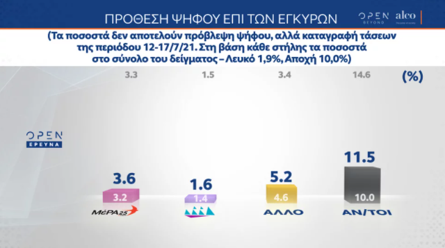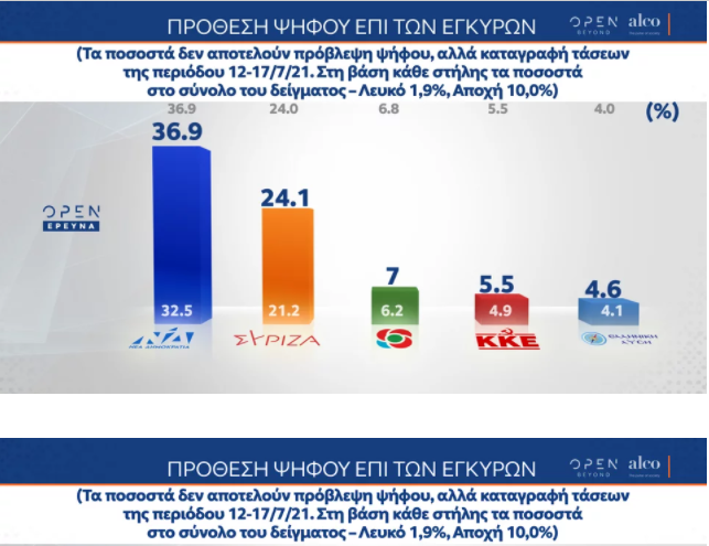 Στην πρόθεση ψήφου επί των εγκύρων από τη δημοσκόπηση της Alco για το Open η ΝΔ συγκεντρώνει ποσοστό 36,9%, ο ΣΥΡΙΖΑ 24,1% (έναντι 24% στην προηγούμενη μέτρηση), το ΚΙΝΑΛ 7% (έναντι 6,8%), το ΚΚΕ σταθερό στο 5,5%, η Ελληνική Λύση 4,6% και η ΜέΡΑ25 3,6%.