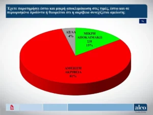 Στην ερώτηση αν έχουν παρατηρήσει αποκλιμάκωση στις τιμές, οι πολίτες απάντησαν στο πλαίσιο της δημοσκόπησης της Alco σε ποσοστό 81% ότι συνεχίζεται αμείωτη η ακρίβεια.