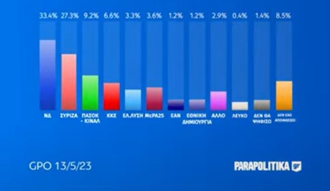Λίγο πριν από τις εκλογές της 21ης Μαΐου, η δημοσκόπηση της GPO για την εφημερίδα ΠΑΡΑΠΟΛΙΤΙΚΑ, η Νέα Δημοκρατία προηγείται του ΣΥΡΙΖΑ κατά 6,1 μονάδες.