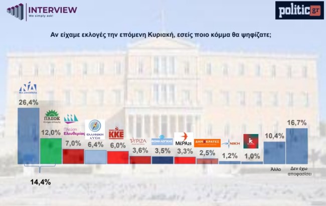 Οι αναποφάσιστοι φτάνουν το 16,7%, ενώ το 10,4% δηλώνει ότι θα επιλέξει άλλο κόμμα.