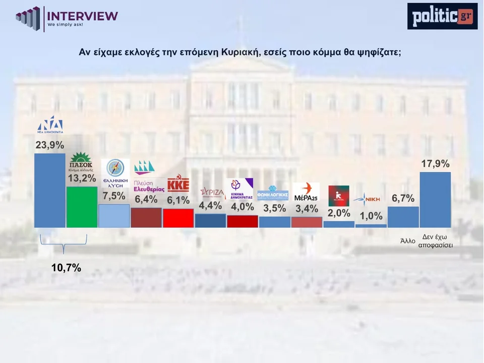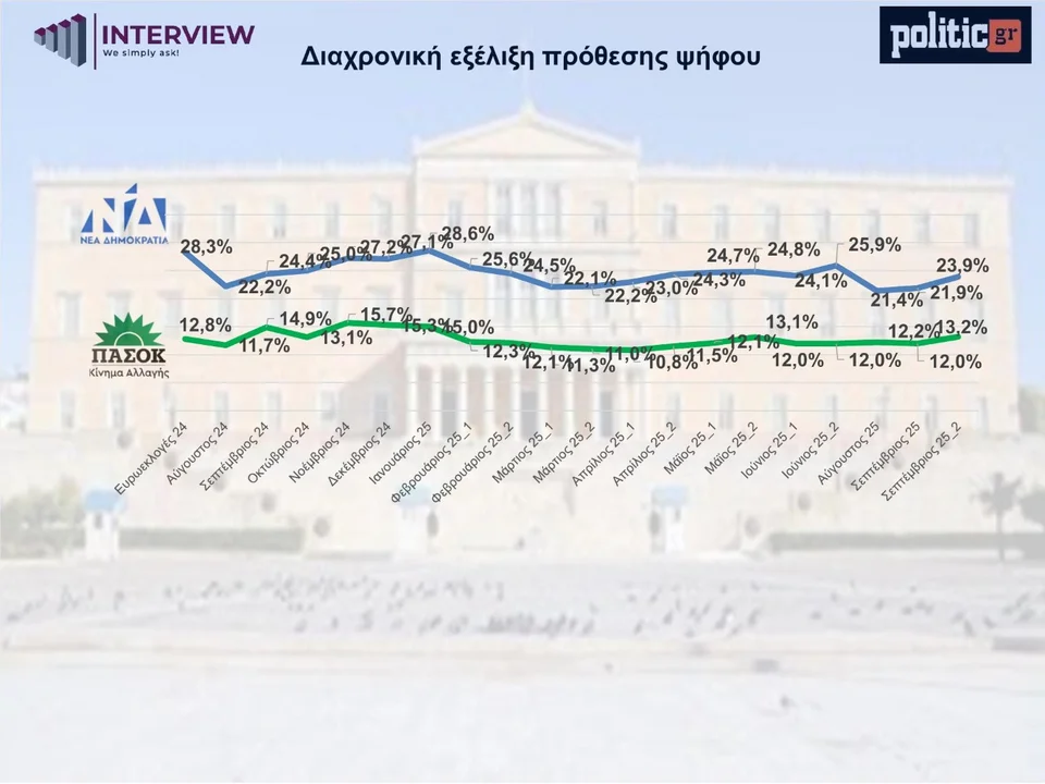 Στις 14,7 μονάδες διαμορφώνεται η διαφορά της Νέας Δημοκρατίας από το ΠΑΣΟΚ στην εκτίμηση εκλογικού αποτελέσματος, σύμφωνα με τη νέα δημοσκόπηση της Interview για το politic.gr.