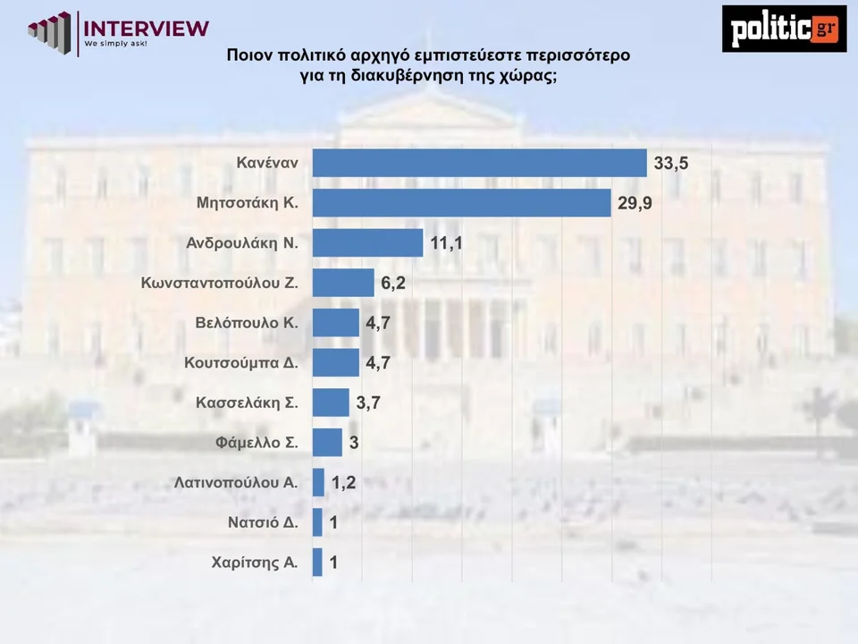 Οι πολίτες δείχνουν μεγαλύτερη εμπιστοσύνη στον Κυριάκο Μητσοτάκη (29,9%) για τη διακυβέρνηση της χώρας, έναντι του Νίκου Ανδρουλάκη (11,1%). Ακολουθούν Ζωή Κωνσταντοπούλου 6,2%, Κυριάκος Βελόπουλος και Δημήτρης Κουτσούμπας 4,7%, Στέφανος Κασσελάκης 3,7%, Σωκράτης Φάμελλος 3%, Αφροδίτη Λατινοπούλου 1,2%, Δημήτρης Νατσιός και Αλέξης Χαρίτσης 1%. «Κανέναν» απαντά το 33,5%.