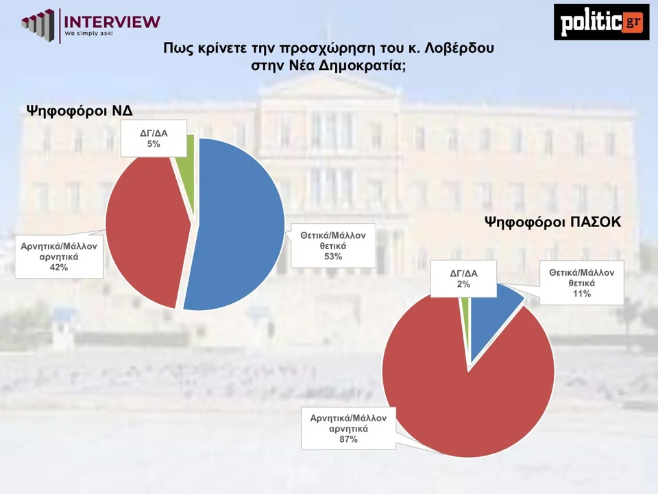 Η προσχώρηση του Ανδρέα Λοβέρδου στη ΝΔ αξιολογείται θετικά από το 53% των ψηφοφόρων του κυβερνώντος κόμματος, ενώ το 42% τη βλέπει αρνητικά. Αντίθετα, το 87% των ψηφοφόρων του ΠΑΣΟΚ την απορρίπτει.