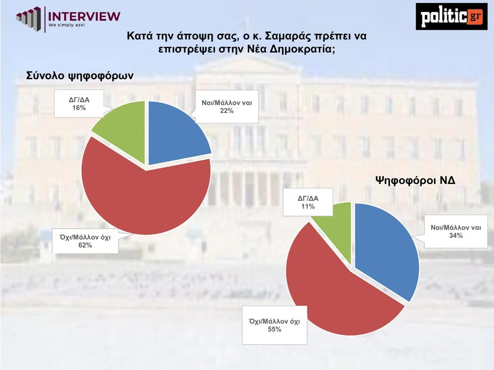 Για ενδεχόμενη επιστροφή Σαμαρά στη ΝΔ, το 62% του συνόλου των ψηφοφόρων απαντά «όχι/μάλλον όχι». Μεταξύ των ψηφοφόρων της ΝΔ, το 34% τη βλέπει θετικά, ενώ το 55% αρνητικά.