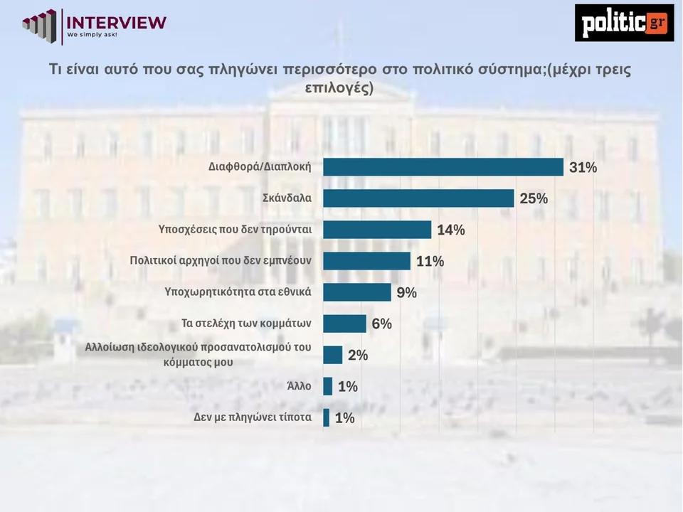 Στους λόγους που πλήττουν περισσότερο την πολιτική ζωή, οι ερωτηθέντες αναφέρουν: